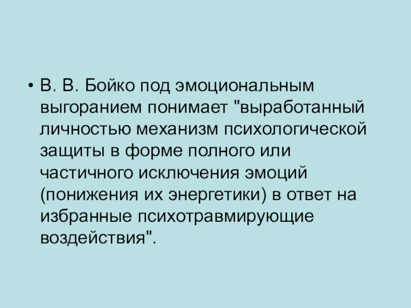 Слайд 4В. В. Бойко под эмоциональным выгоранием понимает "выработанный личностью механизм психологической
