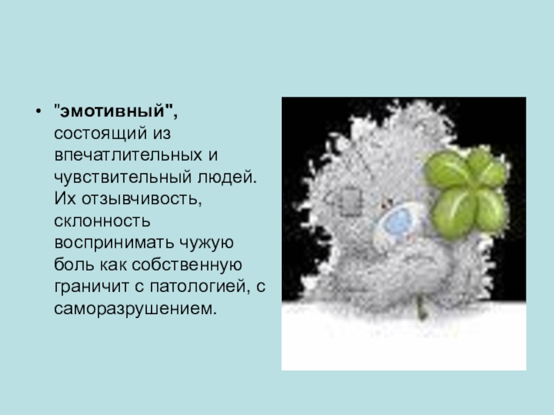 Слайд 11"эмотивный", состоящий из впечатлительных и чувствительный людей. Их отзывчивость, склонность воспринимать