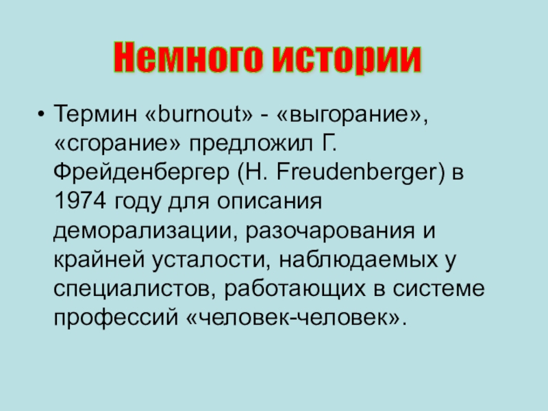 1974 году для описания деморализации, разочарования и крайней усталости, наблюдаемых у специалистов, работающих в системе профессий «человек-человек».