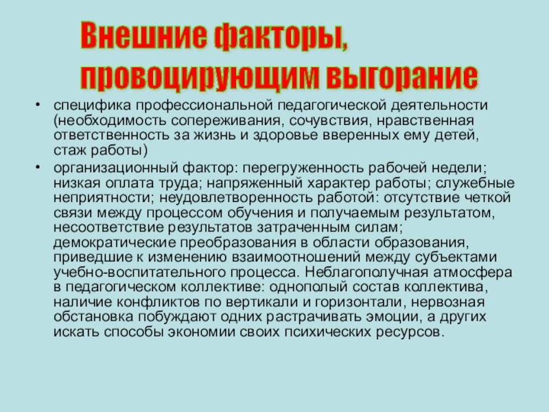 организационный фактор: перегруженность рабочей недели; низкая оплата труда; напряженный характер работы; служебные неприятности; неудовлетворенность работой: отсутствие четкой связи между процессом обучения и получаемым результатом, несоответствие результатов затраченным силам; демократические преобразования в области образования, приведшие к изменению взаимоотношений между субъектами учебно-воспитательного процесса. Неблагополучная атмосфера в педагогическом коллективе: однополый состав коллектива, наличие конфликтов по вертикали и горизонтали, нервозная обстановка побуждают одних растрачивать эмоции, а других искать способы экономии своих психических ресурсов.