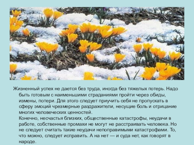 Конечно, несчастья близких, общественные катастрофы, неудачи в работе, собственные промахи не могут не расстраивать человека. Но не следует считать такие неудачи непоправимыми катастрофами. То, что можно, следует исправить. А на нет — и суда нет, как говорят в народе.
