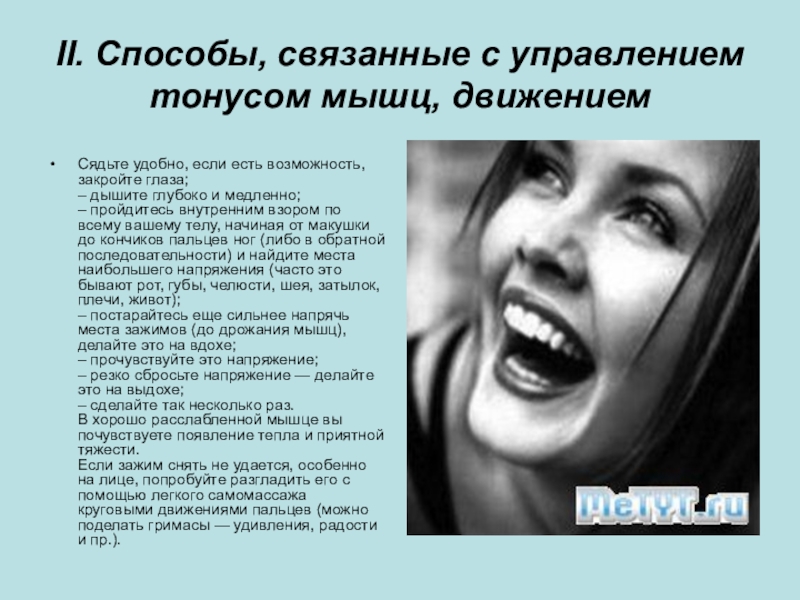 Слайд 28II. Способы, связанные с управлением тонусом мышц, движением