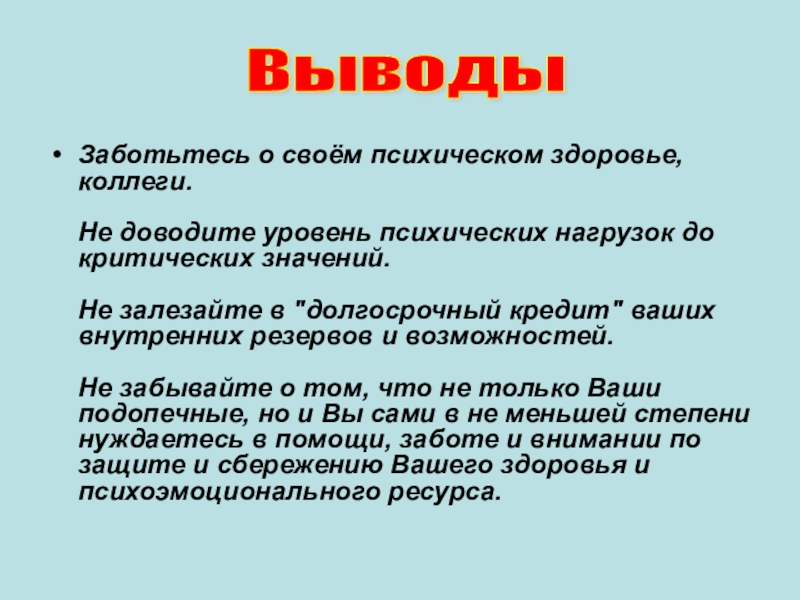 Слайд 31Заботьтесь о своём психическом здоровье, коллеги.
