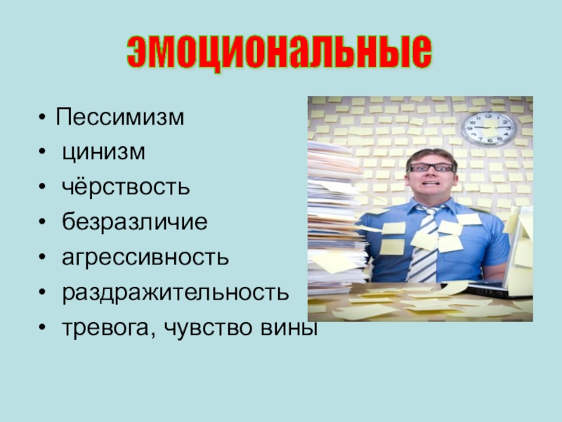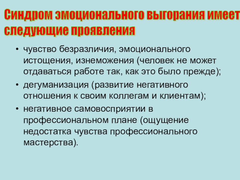 Слайд 12чувство безразличия, эмоционального истощения, изнеможения (человек не может отдаваться работе так,