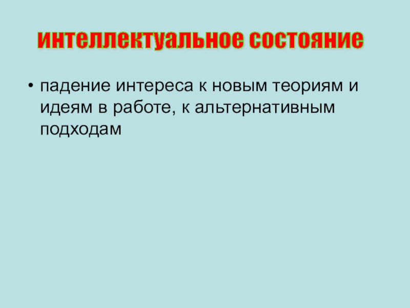 Слайд 16падение интереса к новым теориям и идеям в работе, к альтернативным