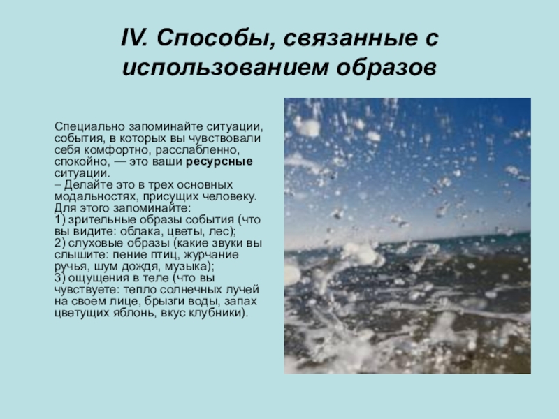 3) ощущения в теле (что вы чувствуете: тепло солнечных лучей на своем лице, брызги воды, запах цветущих яблонь, вкус клубники).