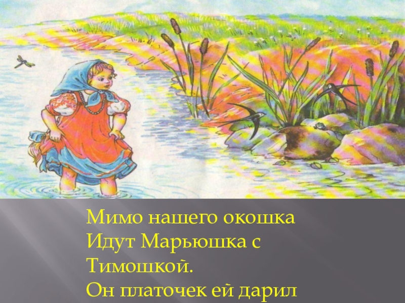 Мимо нашего окошкаИдут Марьюшка с Тимошкой.Он платочек ей дарилИ с собою уводил.