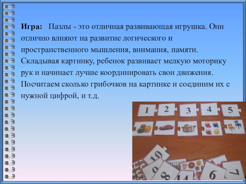 Слайд 5Игра: Пазлы - это отличная развивающая игрушка. Они отлично влияют