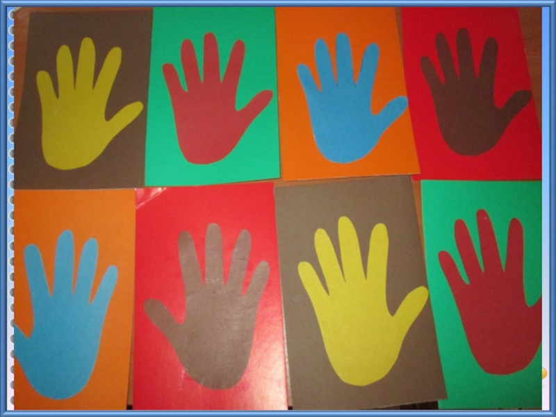 1. Сколько ладошек (например: красного, желтого, зеленого, голубого, коричневого) цвета?