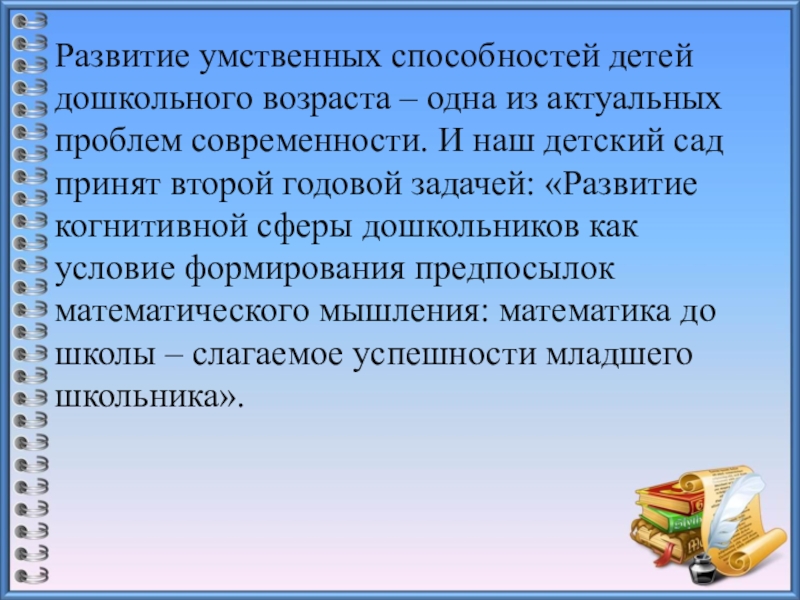 современности. И наш детский сад принят второй годовой задачей: «Развитие когнитивной сферы дошкольников как условие формирования предпосылок математического мышления: математика до школы – слагаемое успешности младшего школьника».