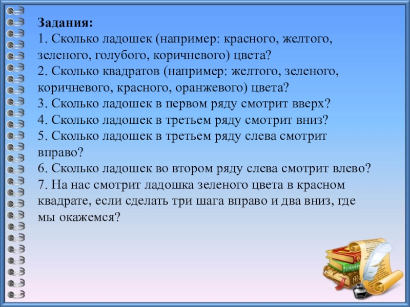 7. На нас смотрит ладошка зеленого цвета в красном квадрате, если сделать три шага вправо и два вниз, где мы окажемся?