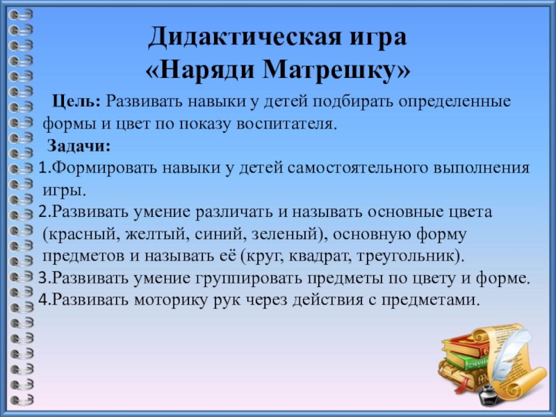 Развивать умение различать и называть основные цвета (красный, желтый, синий, зеленый), основную форму предметов и называть её (круг, квадрат, треугольник).