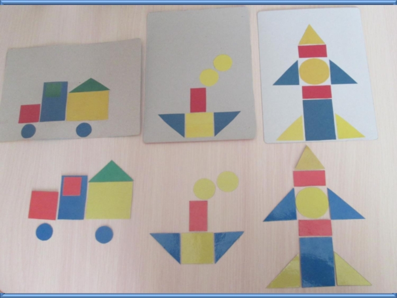 Задачи: Формировать умение различать геометрические фигуры: их форму, цвет, размер. Опираясь на зрительное восприятие составлять изображение предмета, соотнося его положение в пространстве. Развивать мелкую моторику, внимание, мыслительные операции. Развивается речь детей, умение делать выводы.