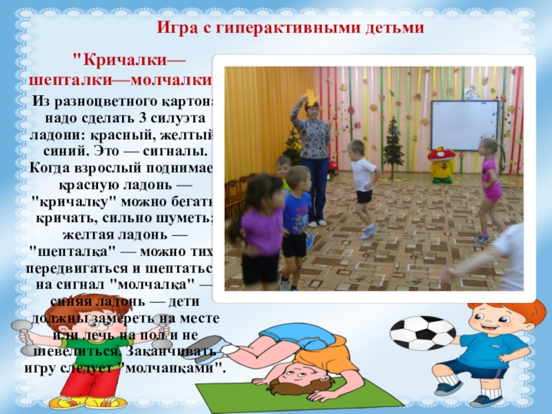 Это — сигналы. Когда взрослый поднимает красную ладонь — "кричалку" можно бегать, кричать, сильно шуметь; желтая ладонь — "шепталка" — можно тихо передвигаться и шептаться, на сигнал "молчалка" — синяя ладонь — дети должны замереть на месте или лечь на пол и не шевелиться. Заканчивать игру следует "молчанками".
