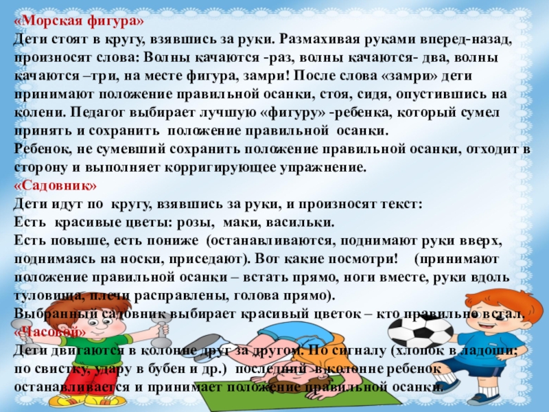 в кругу, взявшись за руки. Размахивая руками вперед-назад, произносят слова: Волны качаются -раз, волны качаются- два, волны качаются –три, на месте фигура, замри! После слова «замри» дети принимают положение правильной осанки, стоя, сидя, опустившись на колени. Педагог выбирает лучшую «фигуру» -ребенка, который сумел принять и сохранить положение правильной осанки.
