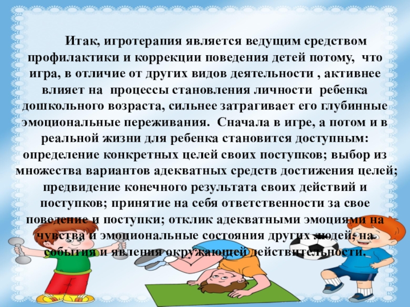 Слайд 27 Итак, игротерапия является ведущим средством профилактики и коррекции поведения детей