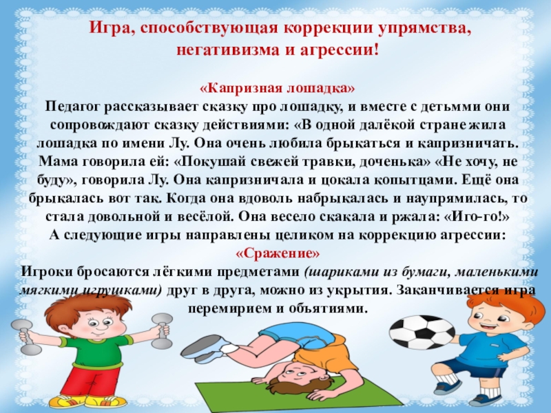 про лошадку, и вместе с детьмми они сопровождают сказку действиями: «В одной далёкой стране жила лошадка по имени Лу. Она очень любила брыкаться и капризничать. Мама говорила ей: «Покушай свежей травки, доченька» «Не хочу, не буду», говорила Лу. Она капризничала и цокала копытцами. Ещё она брыкалась вот так. Когда она вдоволь набрыкалась и наупрямилась, то стала довольной и весёлой. Она весело скакала и ржала: «Иго-го!»