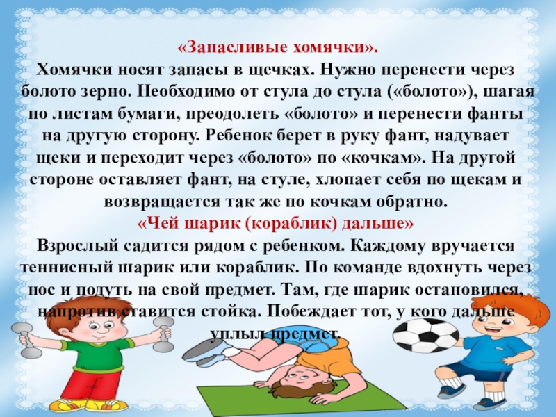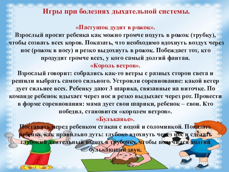 Взрослый говорит: собрались как-то ветры с разных сторон света и решили выбрать самого сильного. Устроили соревнование: какой ветер дует сильнее всех. Ребенку дают 3 шарика, связанные на ниточке. По команде ребенок вдыхает через нос и резко выдыхает через рот. Провести в форме соревнования: мама дует свои шарики, ребенок – свои. Кто победил, становится «королем ветров».