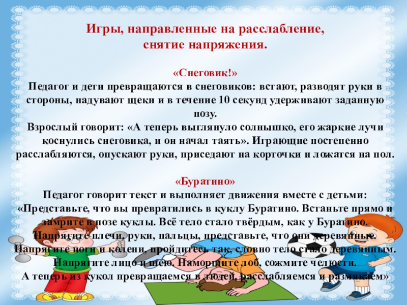 «Представьте, что вы превратились в куклу Буратино. Встаньте прямо и замрите в позе куклы. Всё тело стало твёрдым, как у Буратино.