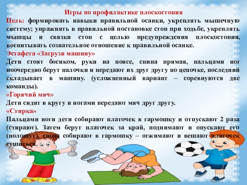 Цель: формировать навыки правильной осанки, укреплять мышечную систему; упражнять в правильной постановке стоп при ходьбе, укреплять мышцы и связки стоп с целью предупреждения плоскостопия, воспитывать сознательное отношение к правильной осанке.