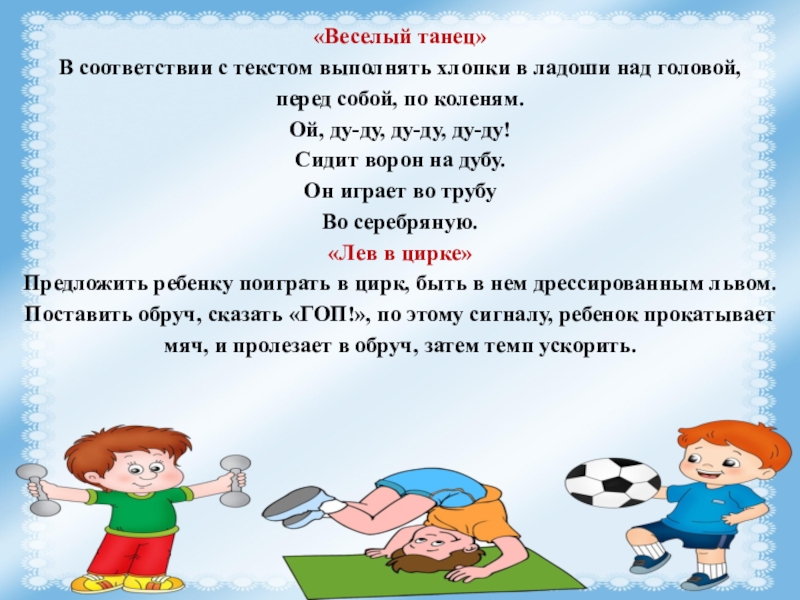 Цель. Развитие координации движений, повышение эмоционального тонуса, развитие чувства ритма и навыка выполнять команды.