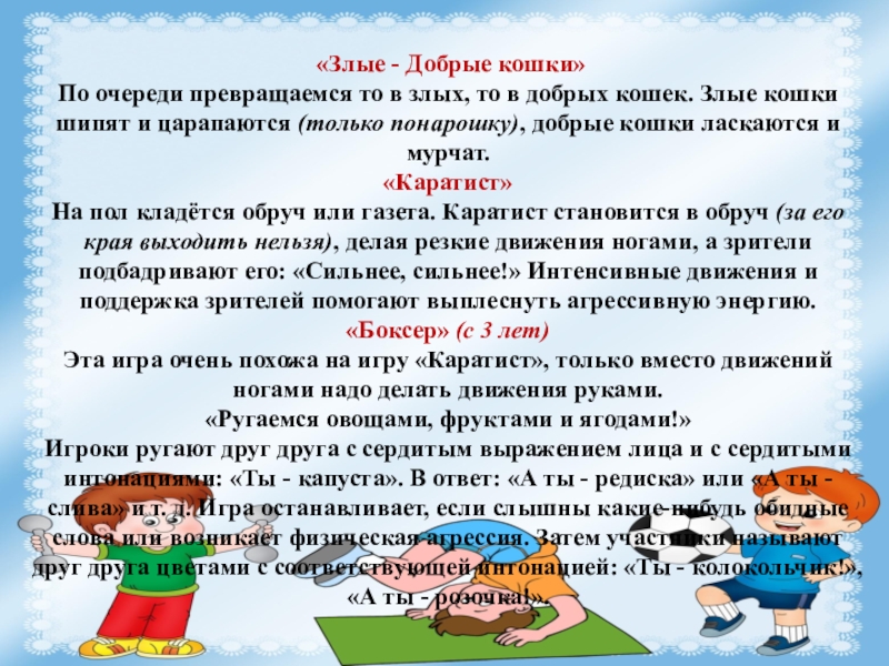 Игроки ругают друг друга с сердитым выражением лица и с сердитыми интонациями: «Ты - капуста». В ответ: «А ты - редиска» или «А ты - слива» и т. д. Игра останавливает, если слышны какие-нибудь обидные слова или возникает физическая агрессия. Затем участники называют друг друга цветами с соответствующей интонацией: «Ты - колокольчик!», «А ты - розочка!».