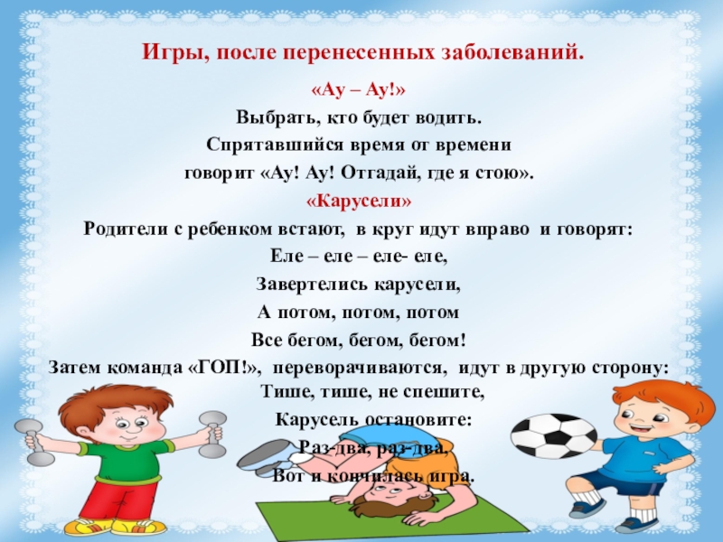 Дети лежат на животе по кругу, лицом в центр круга. Руки под подбородком, ноги вместе. Водящий бросает мяч любому игроку, тот отбивает его двумя руками, при этом, прогибаясь, поднимает голову и грудь. Ноги остаются прижатыми к полу.
