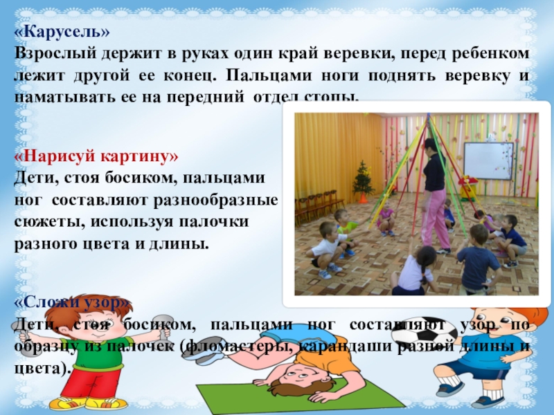 руках один край веревки, перед ребенком лежит другой ее конец. Пальцами ноги поднять веревку и наматывать ее на передний отдел стопы.
