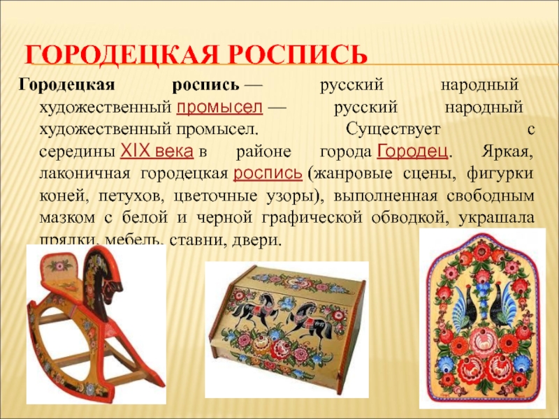Городецкая роспись — русский народный художественный промысел — русский народный художественный промысел. Существует с