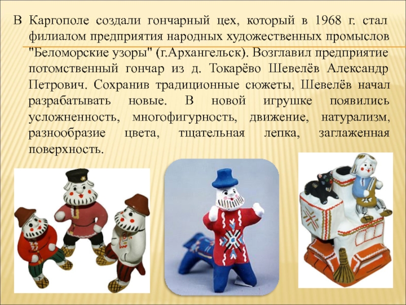 предприятия народных художественных промыслов "Беломорские узоры" (г.Архангельск). Возглавил предприятие потомственный гончар из д. Токарёво Шевелёв Александр Петрович. Сохранив традиционные сюжеты, Шевелёв начал разрабатывать новые. В новой игрушке появились усложненность, многофигурность, движение, натурализм, разнообразие цвета, тщательная лепка, заглаженная поверхность.