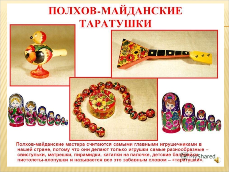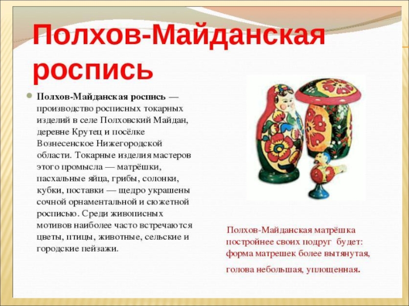 мету возникновения данного народного промысла: семеновская, вятская, сергиева-посадская, тверская, полховская, крутецкая.
