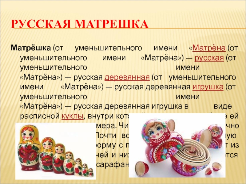 уменьшительного имени «Матрёна») — русская деревянная игрушка (от уменьшительного имени «Матрёна») — русская деревянная игрушка в виде расписной куклы, внутри которой находятся подобные ей куклы меньшего размера. Число вложенных кукол обычно от трех и более. Почти всегда они имеют овоидную («яйцеподобную») форму с плоским донцем и состоят из двух частей — верхней и нижней. По традиции рисуется женщина в красном сарафане и жёлтом платке.