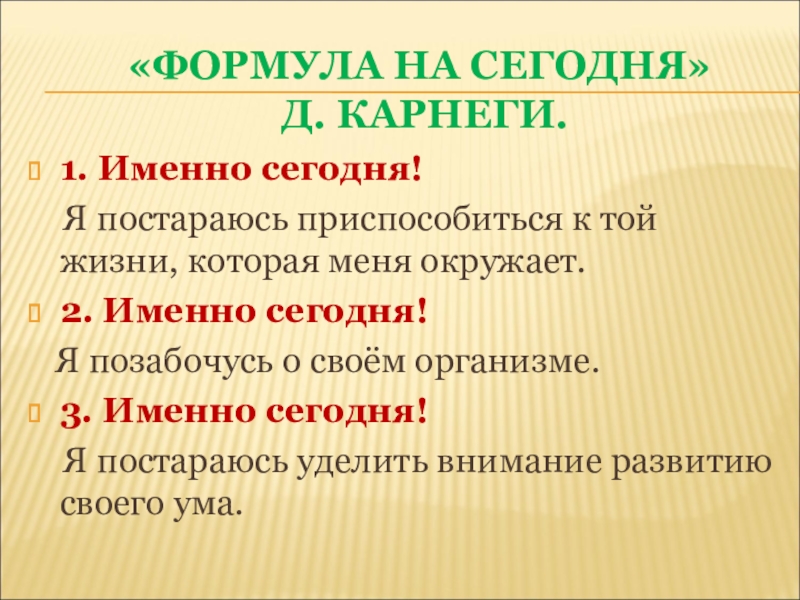 «ФОРМУЛА НА СЕГОДНЯ»  Д. КАРНЕГИ.1. Именно сегодня!  Я постараюсь приспособиться к той жизни, которая меня