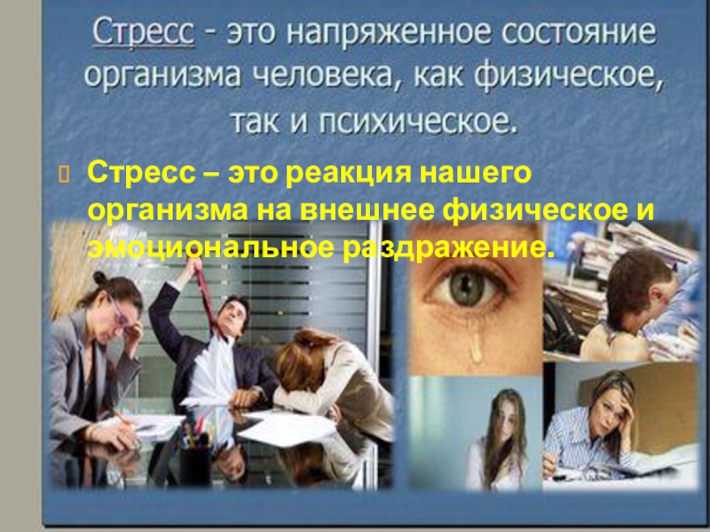 Слайд 2Стресс – это реакция нашего организма на внешнее физическое и эмоциональное