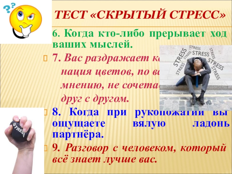 ТЕСТ «СКРЫТЫЙ СТРЕСС»6. Когда кто-либо прерывает ход ваших мыслей.7. Вас раздражает комби-   нация цветов, по