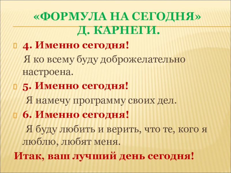 «ФОРМУЛА НА СЕГОДНЯ»  Д. КАРНЕГИ.4. Именно сегодня!  Я ко всему буду доброжелательно настроена.5. Именно сегодня!