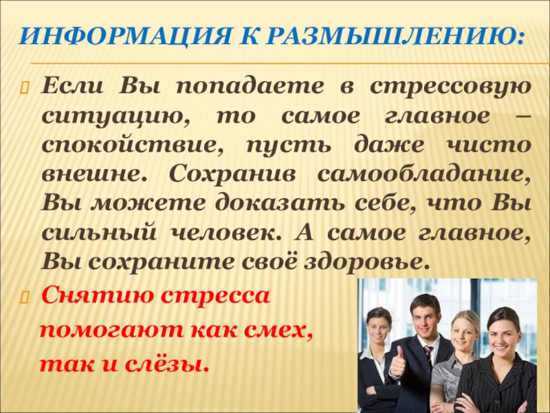 ИНФОРМАЦИЯ К РАЗМЫШЛЕНИЮ: Если Вы попадаете в стрессовую ситуацию, то самое главное – спокойствие, пусть даже чисто
