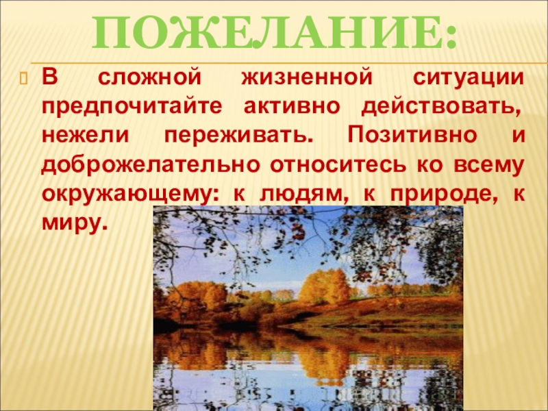 В сложной жизненной ситуации предпочитайте активно действовать, нежели переживать. Позитивно и