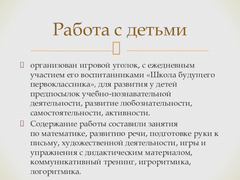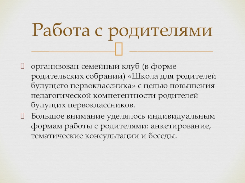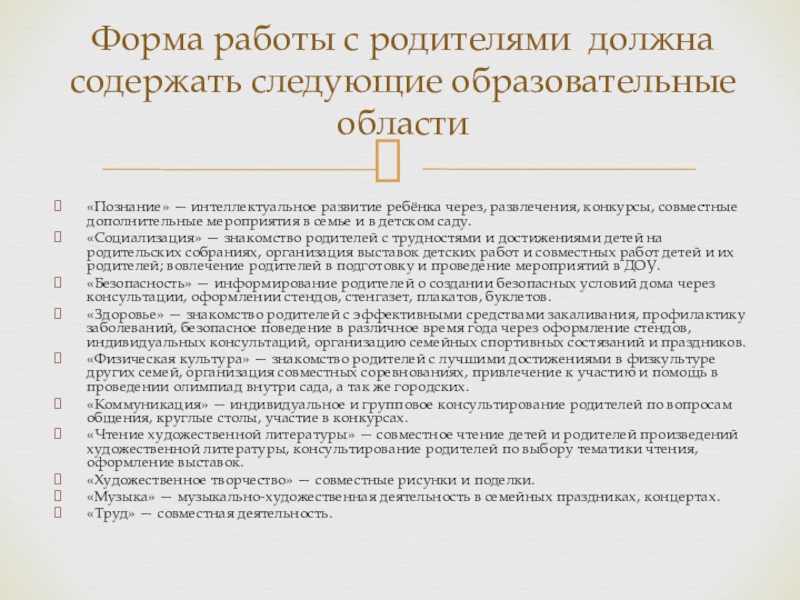 «Социализация» — знакомство родителей с трудностями и достижениями детей на родительских собраниях, организация выставок детских работ и совместных работ детей и их родителей; вовлечение родителей в подготовку и проведение мероприятий в ДОУ.