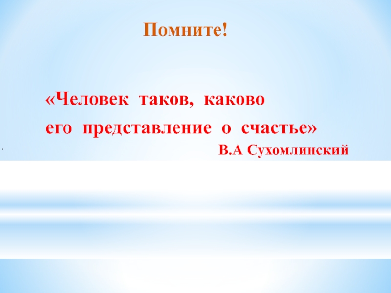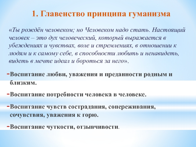 «Ты рождён человеком; но Человеком надо стать. Настоящий человек – это дух человеческий, который выражается в убеждениях и чувствах, воле и стремлениях, в отношении к людям и к самому себе, в способности любить и ненавидеть, видеть в мечте идеал и бороться за него».