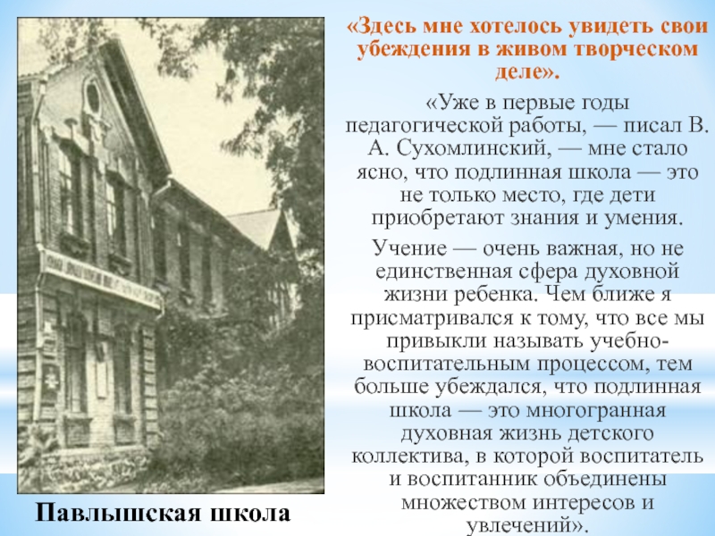в первые годы педагогической работы, — писал В.А. Сухомлинский, — мне стало ясно, что подлинная школа — это не только место, где дети приобретают знания и умения.