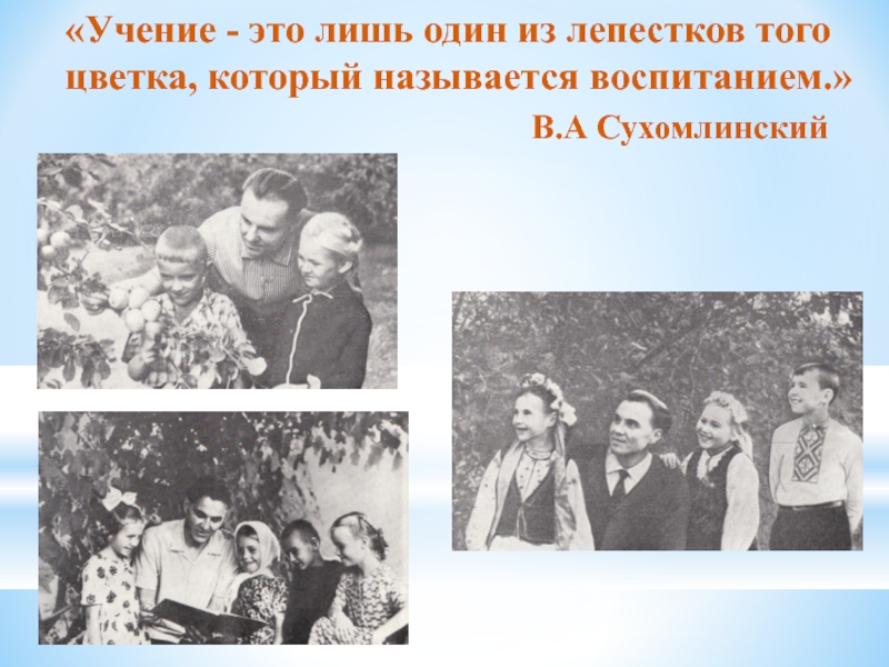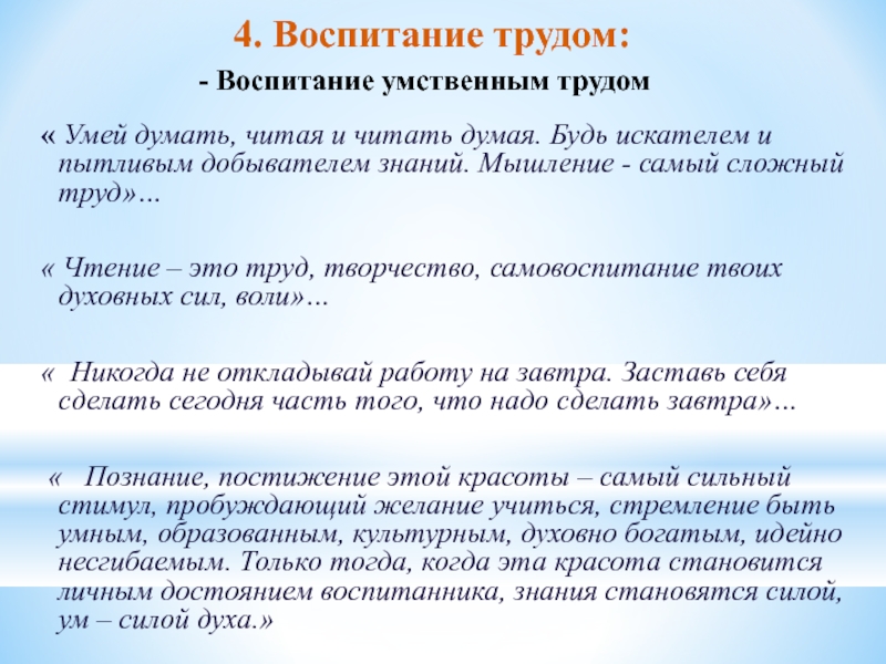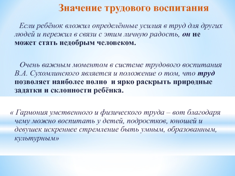 « Гармония умственного и физического труда – вот благодаря чему можно воспитать у детей, подростков, юношей и девушек искреннее стремление быть умным, образованным, культурным»