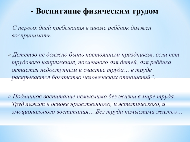 « Подлинное воспитание немыслимо без жизни в мире труда. Труд лежит в основе нравственного, и эстетического, и эмоционального воспитания… Без труда немыслима жизнь»…