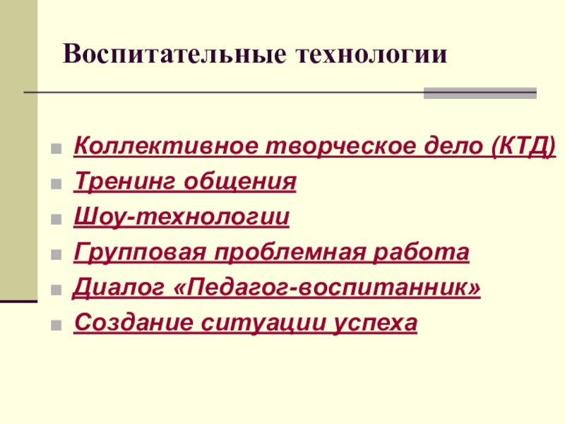 Воспитательные технологииКоллективное творческое дело (КТД)Тренинг общенияШоу-технологииГрупповая проблемная работаДиалог «Педагог-воспитанник»Создание ситуации успеха