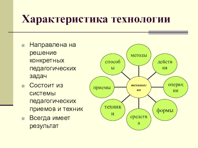 Характеристика технологииНаправлена на решение конкретных педагогических задачСостоит из системы педагогических приемов и техникВсегда имеет результат