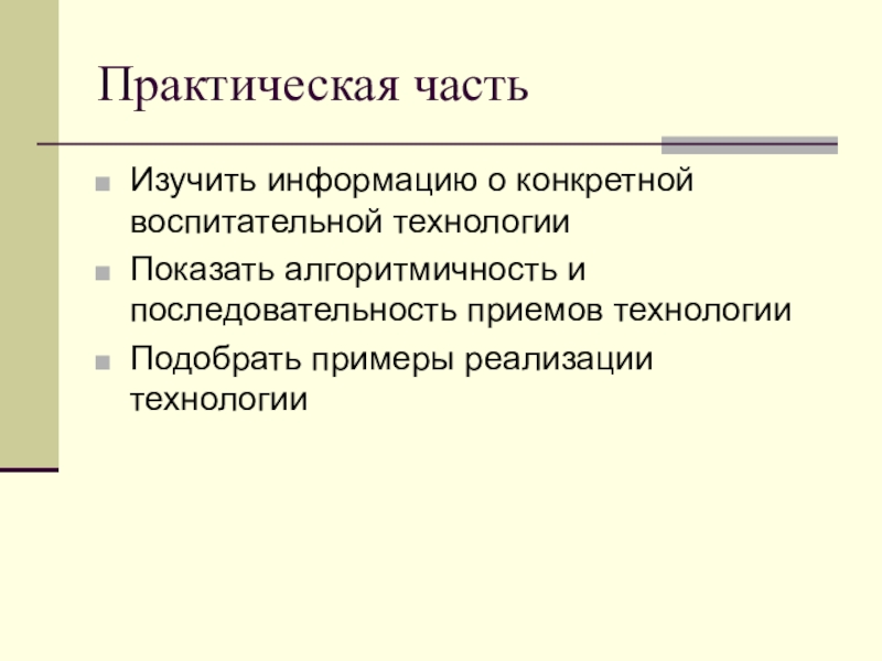 Практическая частьИзучить информацию о конкретной воспитательной технологииПоказать алгоритмичность и последовательность приемов технологииПодобрать примеры реализации технологии