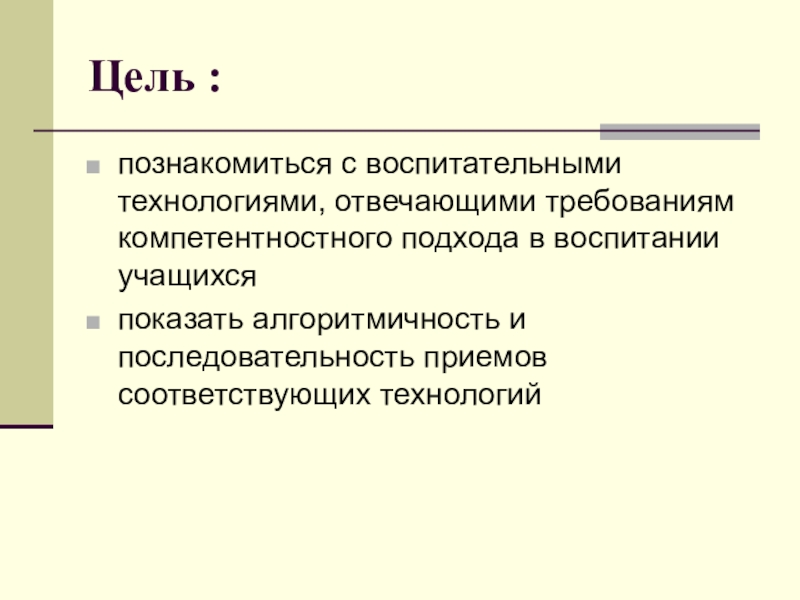Цель :познакомиться с воспитательными технологиями, отвечающими требованиям компетентностного подхода в воспитании учащихсяпоказать алгоритмичность и последовательность приемов соответствующих