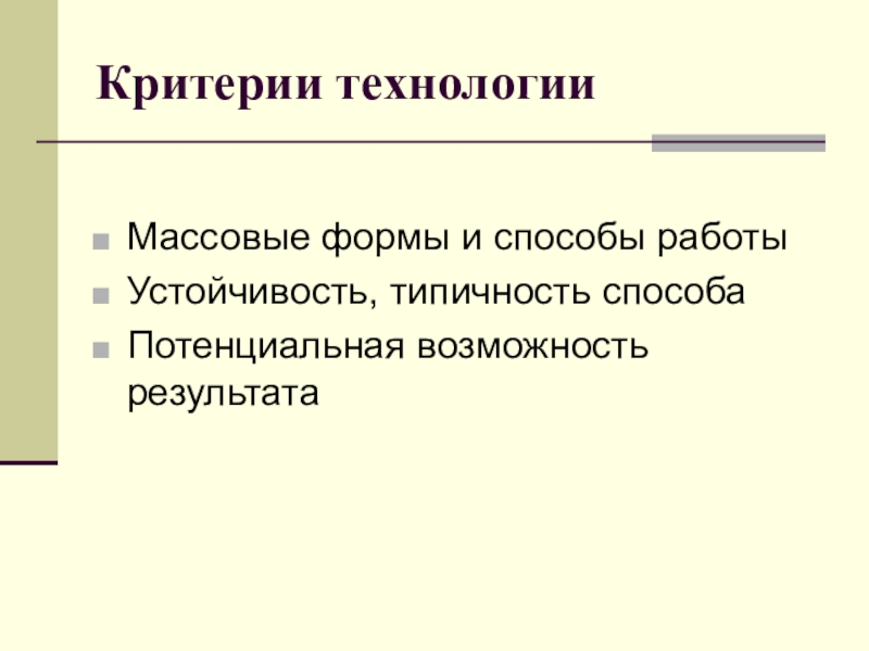 Критерии технологииМассовые формы и способы работыУстойчивость, типичность способаПотенциальная возможность результата