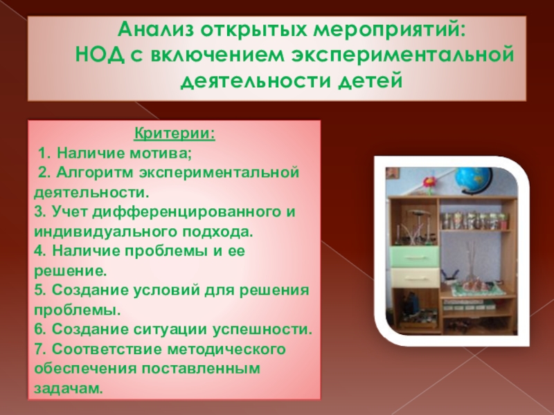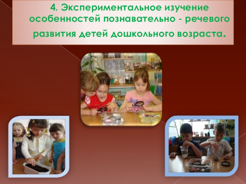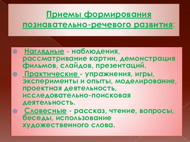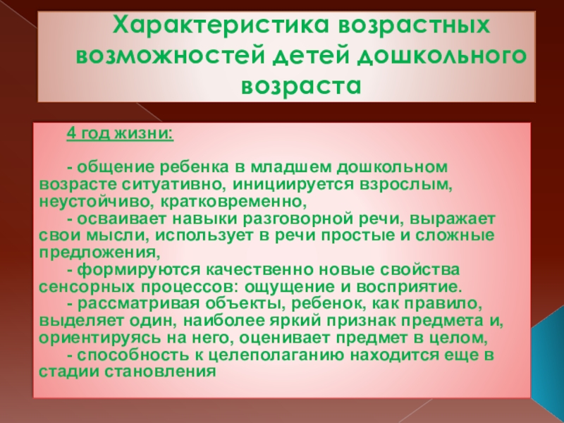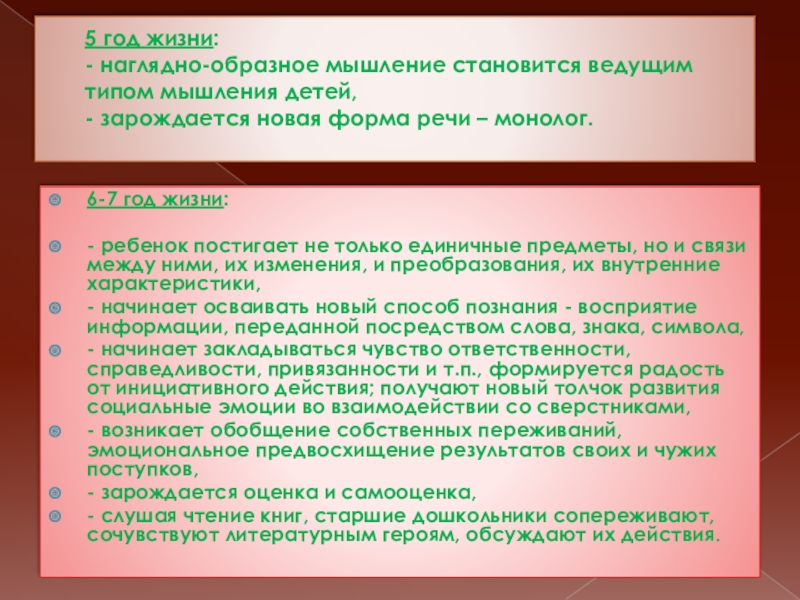 - ребенок постигает не только единичные предметы, но и связи между ними, их изменения, и преобразования, их внутренние характеристики,