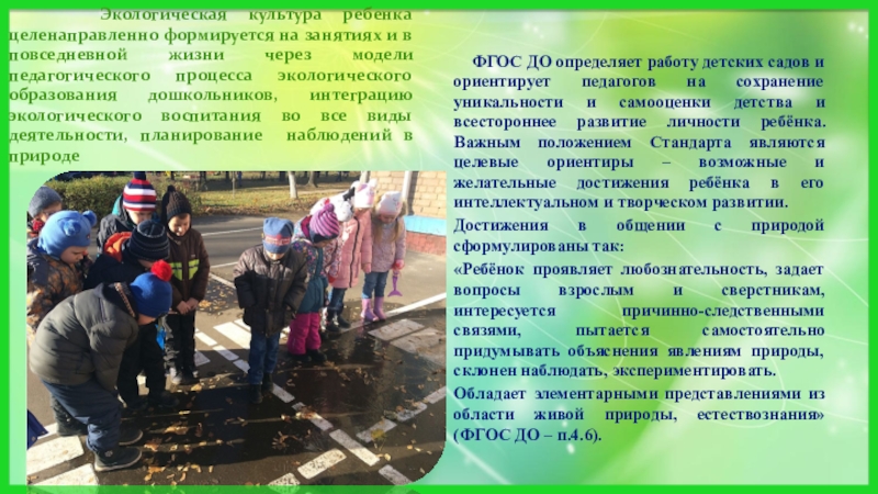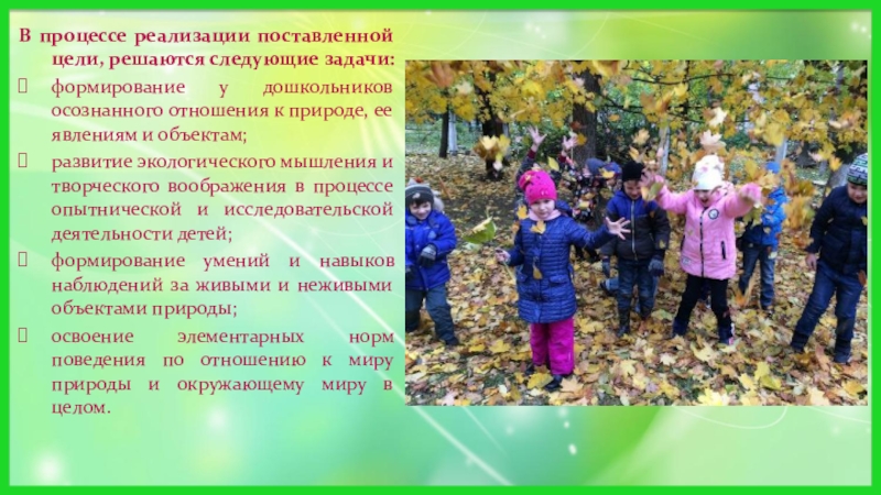 Экологическое образование, полученное в детском саду, является основой для становления и развития экологической культуры ребенка.